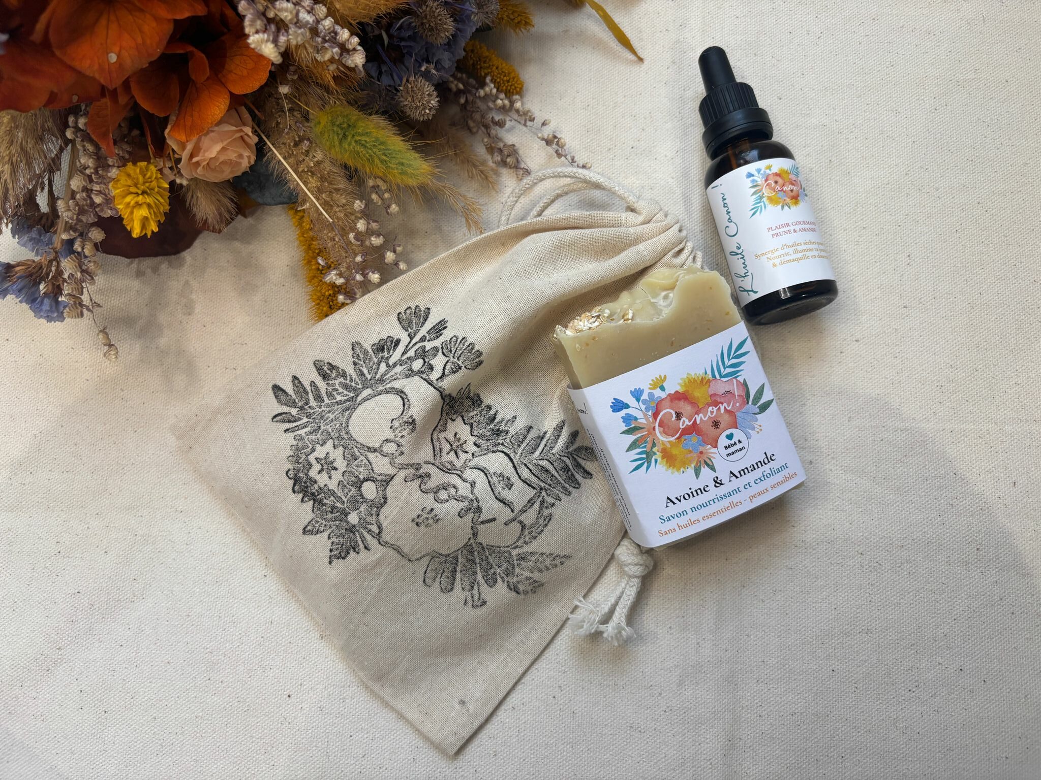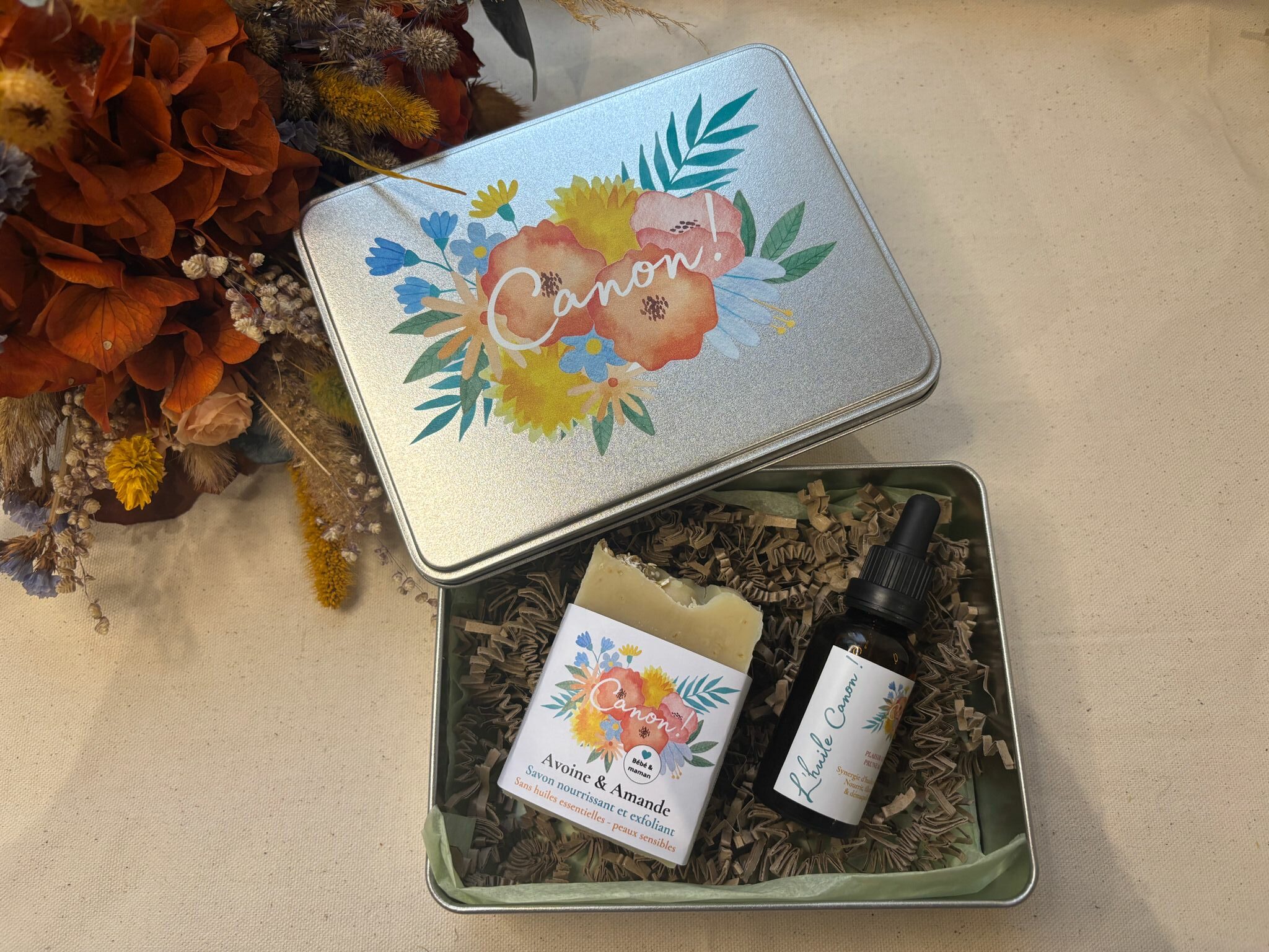 Un joli coffret en métal OU un joli pochon en coton biologique, joliment présenté, contenant :